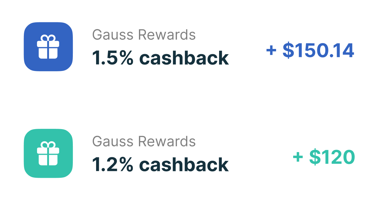 If user's APR is 34%, total balance is $10,000 and fixed monthly payments are $384, user's interest expense until full payoff would be $8,401 vs. $1,990 with Gauss. If user's APR is 24%, total balance is $10,000 and fixed monthly payments are $300, user's interest expense until full payoff would be $6,644 vs. $2,737 with Gauss.